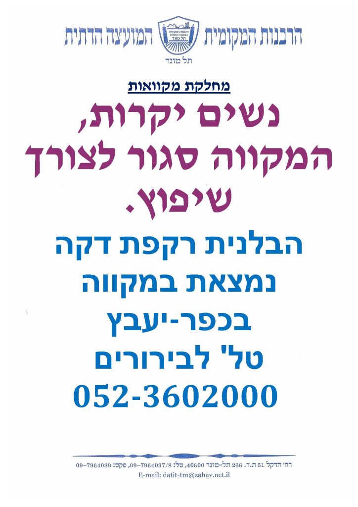 מקווה הטהרה בתל מונד מעניק לנשות היישוב שירות מקצועי, מכבד ומוקפד, מתוך חשיבותה של מצוות הטהרה בחיי המשפחה. המקווה מופעל תחת פיקוח הלכתי ורבני צמוד, תוך שמירה על ניקיון, פרטיות מלאה ותחושת ביטחון לנגיעות כל אחת.